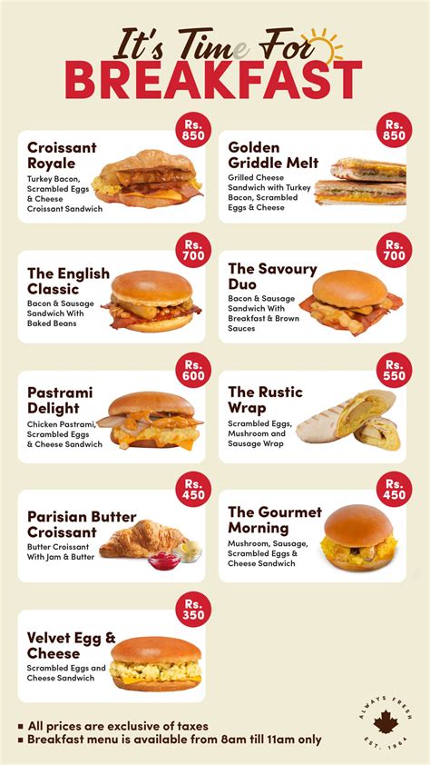 Tim Horton Breakfast Menu. Web a breakfast sandwich usually hits the right spot in the mornings, and there are plenty available on the tim hortons breakfast menu. We update our database frequently to ensure that the prices are as accurate as possible.